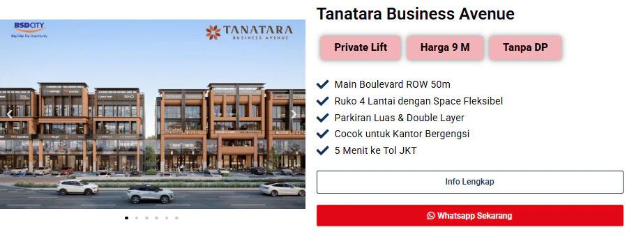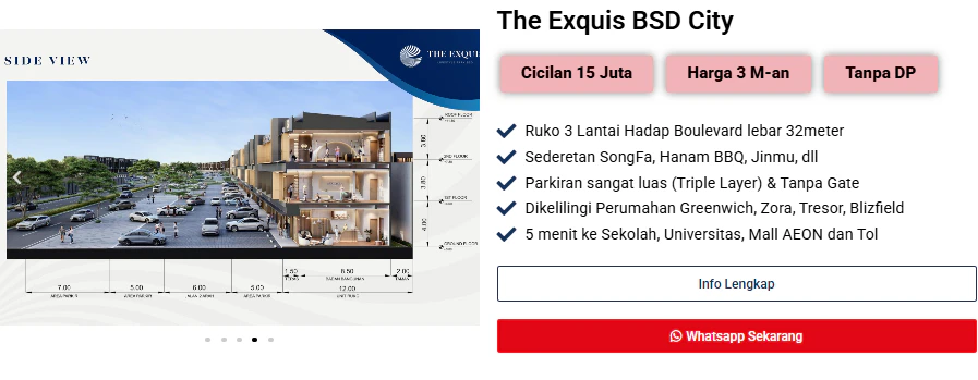 • Dapat dibeli tanpa DP. Unit di Ruko Exquis, Tanatara Business Avenue, Asterra BSD City, Delrey dan Alunara. Bisa langsung Anda miliki tanpa DP, sehingga modal usaha tetap utuh untuk keperluan ekspansi bisnis