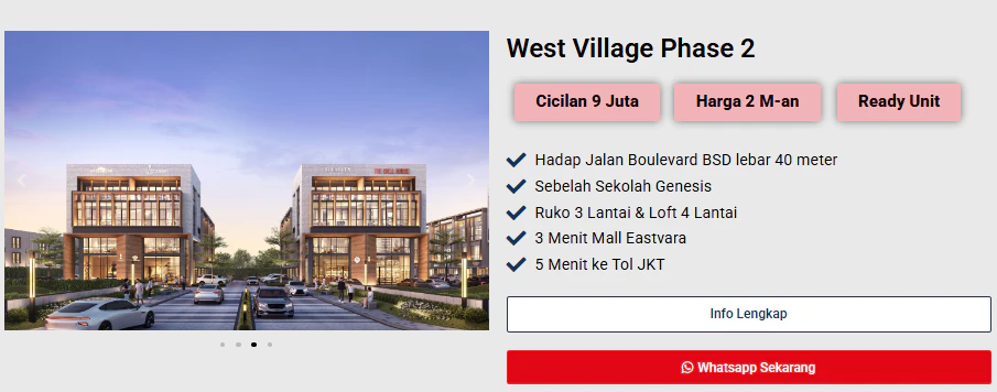 Berada di area Boulevard Barat BSD, unit Ruko West Village Phase 2 menempati kawasan pengembangan baru yang sangat dinamis karena berdekatan dengan Eastvara Mall.
